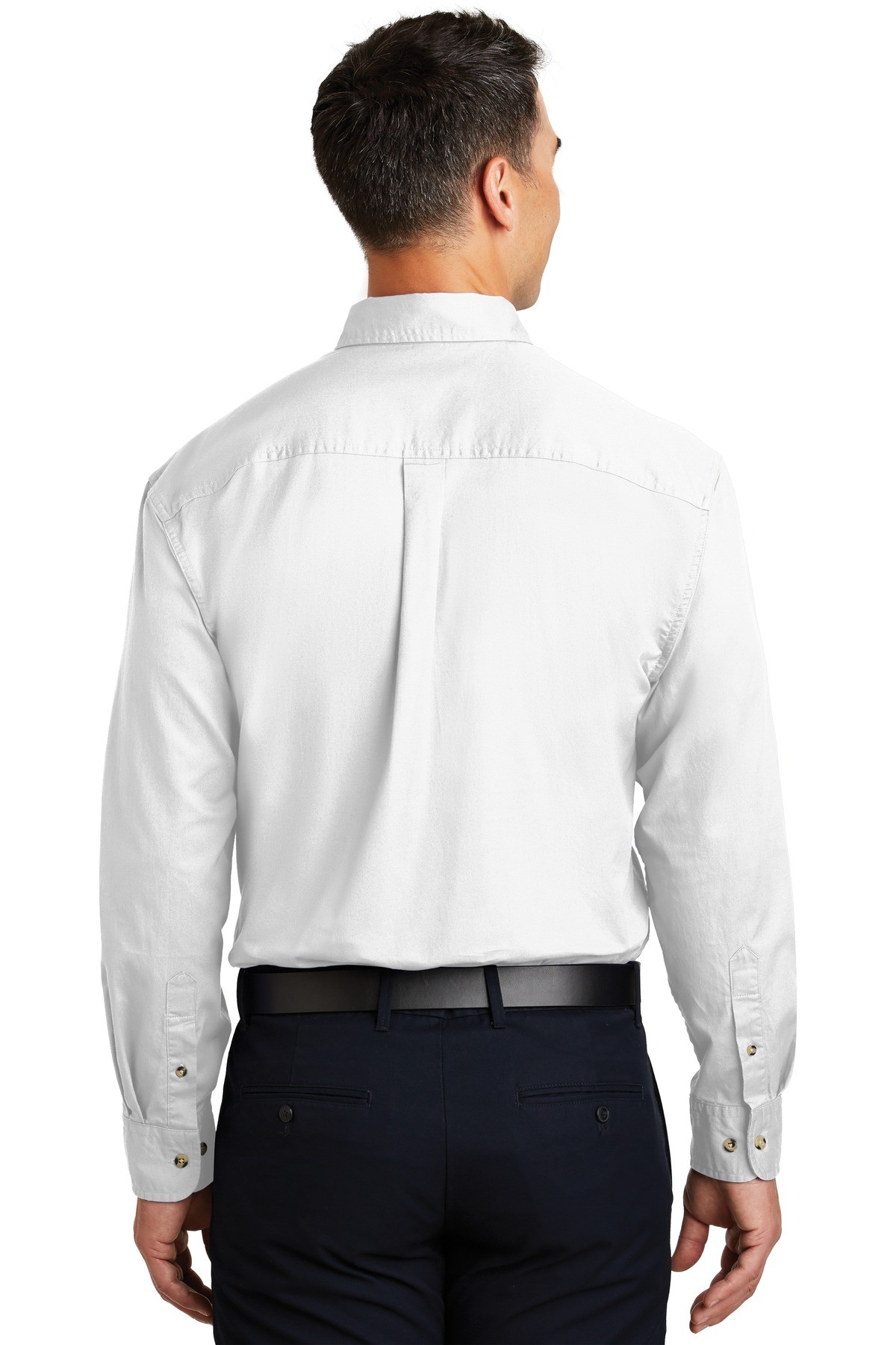 Our twill shirt has a professional appearance with comfortable, garment-washed softness. | 5-ounce, 100% cotton Double-needle stitching throughout Button-down collar Horn-tone buttons Left chest pocket Back box pleat Rounded adju