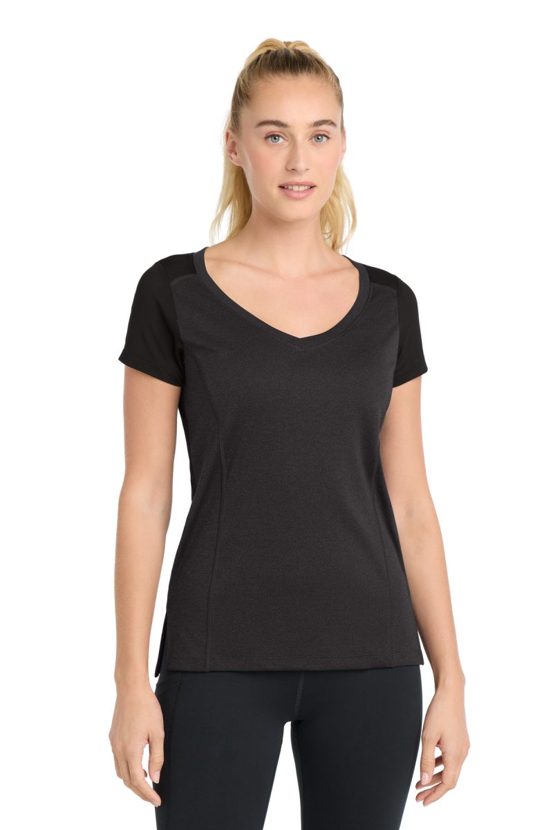 With a subtle heather texture and mesh panels at targeted heat zones, this tee has moisture-wicking technology, breathability and stretch for optimum performance. 4-ounce, 100% polyester with PosiCharge technology Dyed-to-match neck band