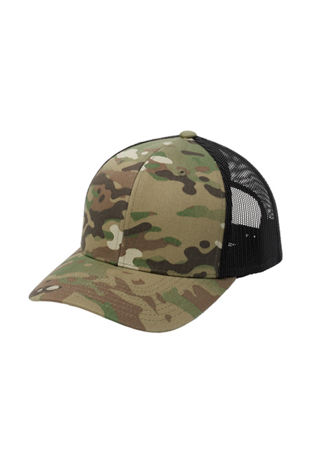 60/40 cotton/poly front panels; 100% polyester mesh back panels, 98/2 cotton/spandex front panels; 100% polyester mesh back panels (Multicam) Structured Mid-profile Permacurv bill to maintain proper shape and curve 7-position adjustable snapback